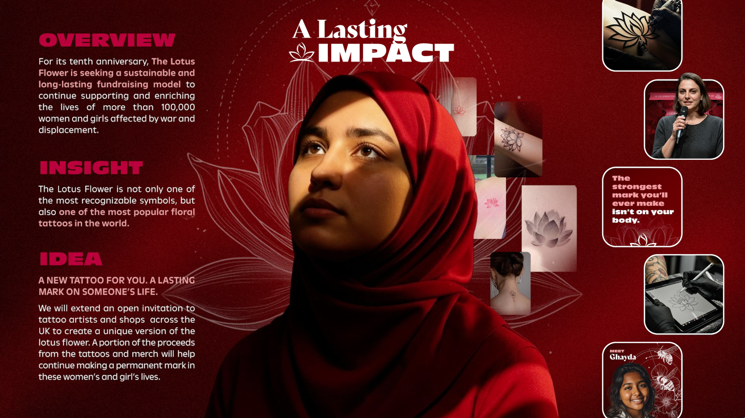 Then it clicked. We rallied around a beautifully unexpected concept, one we knew would make the judges pause. It might not have been the most traditional long-term brand fit, but it had undeniable emotional and financial potential. Our idea, “A Lasting Impact,” imagined a partnership with leading UK tattoo artists who would donate to The Lotus Flower every time a lotus flower tattoo was inked in honor of women and children rising from hardship.